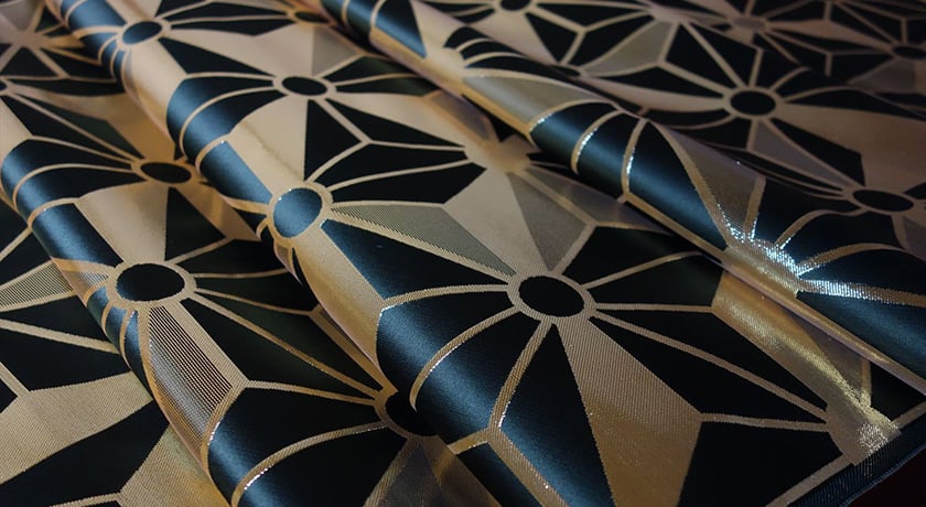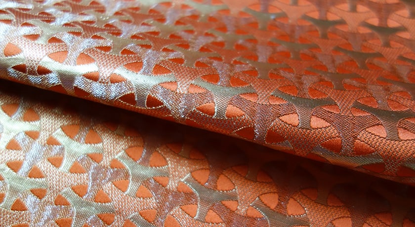 西陣独自のジャカードや織機、技法の使い分けにより、絹の色艶をより際立たせた絹織物です。